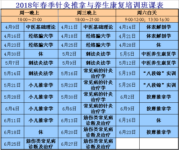 【教 材】本培训班不提供教材,老师为PPT授课,学员可拍照或记笔记。学员如自己有教材,可用自己的;如需购买教材,可自行购买,正规出版社出版均可。我校推荐采用中国中医药出版社出版的全国高等中医药院校用中医专业本科生教材:《中医基础理论》、《正常人体解剖学》、《针灸学》、《按摩推拿学》、《中医养生康复学》。其中《经络腧穴学》可采用人民卫生出版社出版、沈雪勇主编的配光盘教材。