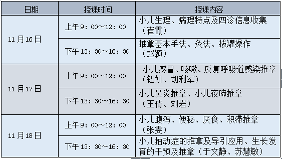 本次培训班,结合小儿生理病理特点,对感冒、咳嗽、反复呼吸道感染、厌食、腹泻、便秘、夜啼等常见病的中医诊疗及护理,尤其是小儿推拿操作进行详细讲解,培训内容还涉及近年发病率增高的多发性抽动症、生长发育迟缓等的预防与调护;为确保培训效果,对小儿推拿、拔罐走罐、灸疗等常见中医外治法进行实践操作指导,强调实用。