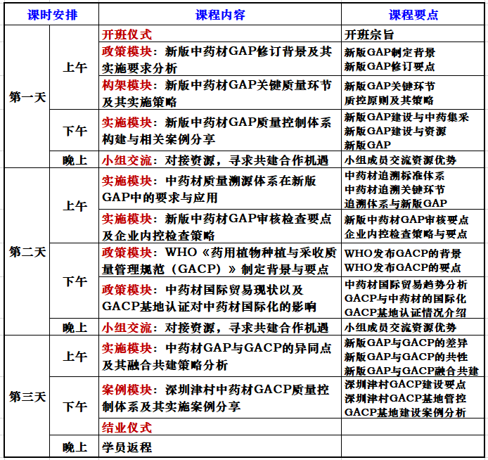 针对上述问题,本次高级研修班邀请了新版中药材GAP和GACP的起草专家、在GAP和GACP基地建设中有实战经验的专家,精心打磨了一套从理论到实践的模块课程,从而实现化繁为简,把控要点,基于自有中药材品种特点,利用3天时间,快速形成GAP和GACP建设的落地思路,快速寻找适合自己联合建设GAP和GACP基地的合作伙伴,开启中药材标准化建设的里程。